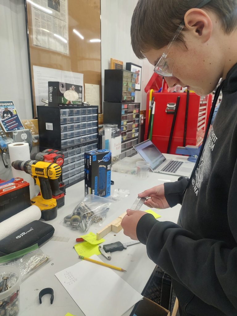 Our newest participant, Asher was busy making his badge and was instructed on the use of a few of the power tools in the process. Carter inspected the hub for cracks. The A.D.A.H.A.R.S. was previously installed upside down on the RV which needed to be corrected. The trim motor was removed to be inspected to see if it meets the requirements according to the Service Bulletin.